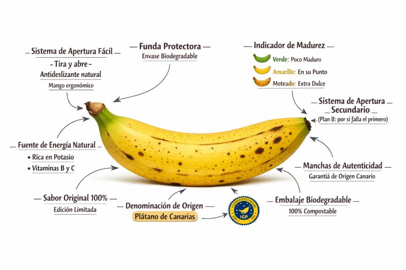 PROMPT: Crea una imagen de un plátano horizontal que destaque la sabiduría de la naturaleza en el diseño de los envoltorios, con etiquetas de texto alrededor que señalen los atributos de un plátano como si se tratase de un producto. Por ejemplo, el rabo es el sistema de apertura fácil, el otro extremo es el sistema de apertura secundario, para el caso de que falle el primero, la piel es la funda protectora biodegradable, el color de la piel indica el nivel de madurez, también indica el valor nutricional asociado a cada fase de nivel de madurez, las manchas negras indican la autenticidad del origen y su pertenencia a la denominación de origen Plátano de Canarias. Añade otras etiquetas que reflejen atributos similares.